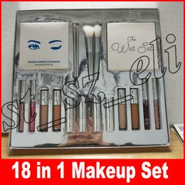 A makeup set display with a total of 18 products, including 6 eyeshadows, 6 lipsticks, and 6 brushes. The eyeshadows are arranged in two rows of three, with the top row having shades of brown and the bottom row having shades of pink. The lipsticks are also arranged in two rows of three, with the top row having shades o... | Wholesale christmas color palettes - Silver Series Makeup Set Wet Set Blue Honey Palette Skin Concealer Lipstick Lip Gloss Make up Brushes 18 in 1 Kit | 53556faabefaca96a62862af90b2d244316d19213c0024734860a309416d67a4 | 000000030520 | 0 | 0 | 106 | 26 | 0 | 0 | |