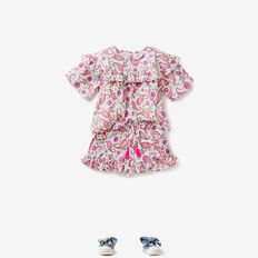 A pink floral dress with a ruffled collar and a pink bow on the waist is displayed against a white background. The dress is paired with a pair of blue and white sneakers with a pink bow on the left shoe. | Paisley Frill Top MULTI hi-res | d2357b0fd5c4a6055dd50494a9a53e86c082ca3ff6d963e4e2772208ea32092d | 000000030592 | 0 | 0 | 41 | 5 | 0 | 0 | |