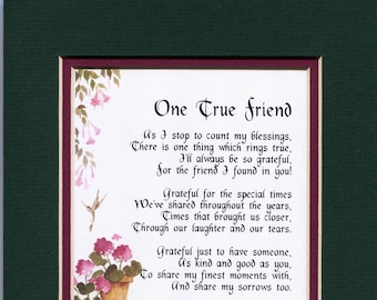 A framed picture of a poem titled 'One True Friend' with a floral border. The poem is written in a cursive script and is divided into four stanzas. The first stanza reads 'As I stop to count my blessings, there is one thing which rings true, always be so grateful for the friend that you found in you!' The second stanza... | what is a good friend poem | 6ac5ea3727d01150d9836bcfdc5dc352b2a21727e5ea587708d594f8985b4ca9 | 000000030684 | 0 | 0 | 106 | 6 | 0 | 0 | |