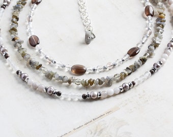 A close-up view of a multi-strand necklace with various beads, including white pearls, brown and black beads, and a silver pendant. The beads are arranged in a pattern with the white pearls interspersed among the other beads. The background is a textured white surface with a small piece of paper featuring text and a fl... | Gray Gemstone Necklace - Three Strand Beaded Necklace with Labradorite, Smoky Quartz, Pearls and Czech Glass, OOAK | 19d32a7fb981df62d80674ba18fe38fe4e3add514d3de48e10c4a1e640d6c2b6 | 000000030616 | 0 | 0 | 63 | 17 | 0 | 0 | |