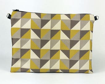 A geometric patterned fabric bag with a zipper closure is displayed against a white background. The bag features a combination of beige, brown, and yellow tones, with a repeating pattern of triangles and squares. The fabric has a textured appearance, and the bag is positioned with the zipper on the right side. | Yellow geometric pattern jacquard pouch | 6e3e446bef04151001866303229748ca799fbb6a3630fc0203e39dd0e377e774 | 000000030593 | 0 | 0 | 52 | 5 | 0 | 0 | |
