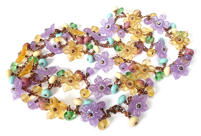 A close-up image of a colorful beaded necklace with a variety of beads including flowers, hearts, and other shapes. The beads are predominantly in shades of purple, yellow, and green, with some beads featuring a metallic finish. The necklace is arranged in a way that creates a heart shape in the center, with the beads ... | Lampwork glass 'Garland' long necklace by Laura Sparling | f0ebd6553f64c3588e8801aa0ba93ce79a3d2bb4c84870bdba3ddc30309de599 | 000000030689 | 0 | 0 | 62 | 8 | 0 | 0 |