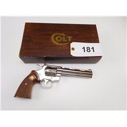 A silver revolver with a wooden handle is displayed on a white background. The revolver is placed on top of a wooden box with a gold 'COLT' logo and a white tag with the number '181' attached to it. | COLT , MODEL: PYTHON , CALIBER: 357 MAGNUM | 78b1a2571a2d3d7c4e2842f3fc031c024c5bb59a8c2363adbcc538b7533753cd | 000000031098 | 0 | 0 | 39 | 8 | 0 | 0 | |