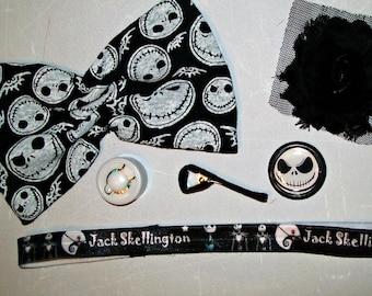 A collection of Jack Skellington-themed items is displayed on a white surface. The items include a black and white bow tie with a skull and crossbones pattern, a black and white polka dot scarf, a black and white polka dot fabric piece, a black and white polka dot lace piece, a black and white polka dot button, a black... | Hairbow - Headband - DIY Make your own - Nightmare Before Christmas - 6 pieces - Music | 14bab0fa77d9a2f79a3df67165d33f875f67fca7257ef5c5f9c8b4400aca68ee | 000000031066 | 0 | 0 | 85 | 17 | 0 | 0 | |