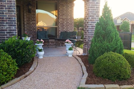 A well-maintained brick house with a stone pathway leading to the front door. The pathway is flanked by neatly trimmed green bushes and two white flower pots with pink flowers. The house has a brick facade with a window that reflects the surrounding trees. The scene is set during the day with clear skies. | Spacious 4/3 Home by Golf, Lake, DFW in Quiet Area - Mansfield - Ev | c7137e2c90f4f3e7e2ac4343bfaf97d10b2c0cd3017c709110f596e6d278f1e8 | 000000031217 | 0 | 0 | 54 | 14 | 0 | 0 | |