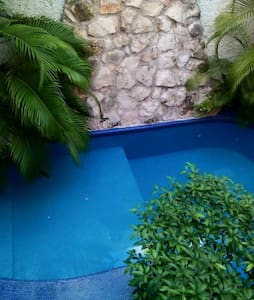A small, rectangular swimming pool with blue tiles is surrounded by lush greenery. The pool is situated in a garden with a stone wall on one side and a large palm tree on the left. The water is clear, and the pool is empty, giving a sense of tranquility. | Home sweet home wt pool in downtown - Playa del Carmen - Apartment | 7514329898d21fe8fa8a4aa5b71a41204b29555fb5dc55b7a9f736693f828892 | 000000031167 | 0 | 0 | 49 | 13 | 0 | 0 | |