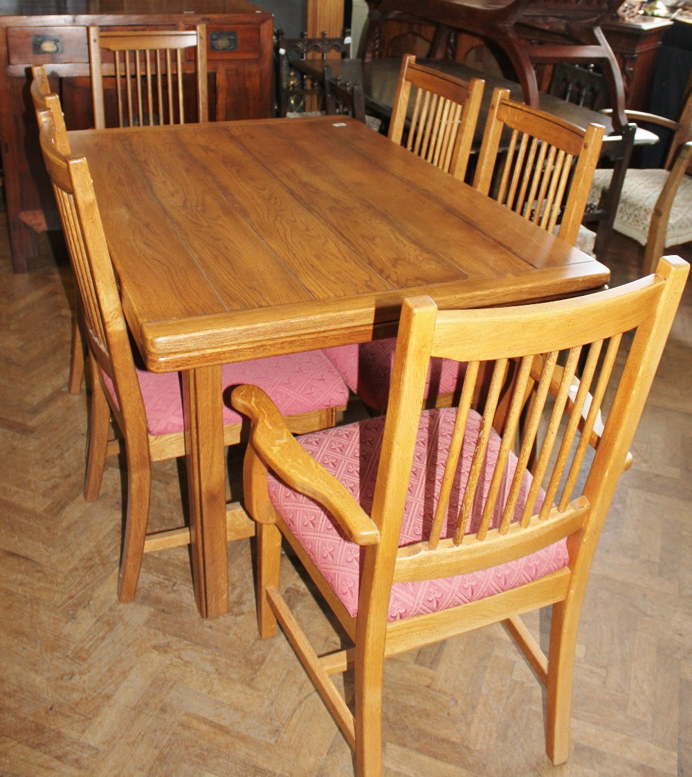 A wooden dining table with a matching wooden chair with a pink cushioned seat is set in a room with wooden flooring and other wooden furniture in the background. | sherry furniture. Lot 905 - Quality Oak Draw Leaf Dining Table With Six Chairs Including Two Carvers By Sherry Furniture S | 0432dbba2d7ce06219c7ce0b8a84d593b5fae7c58fbb6e47854d5ff17d4b078d | 000000031152 | 0 | 0 | 29 | 21 | 0 | 0 | |