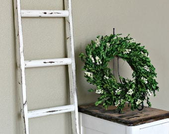 A white ladder is leaning against a wall next to a wooden table with a green wreath on it. The wreath is made of green leaves and white flowers, and it is placed on a wooden surface. The wall is painted in a light color, and the floor appears to be a light-colored carpet. | Ladder Vintage Rustic, Blanket Ladder, distressed pot rack, White Wood Furniture, 5', woodworking, step ladder, wood | 964e0980a32c43a89ceee342d96f369f516e031ec44ab98878252a534e605de0 | 000000031184 | 0 | 0 | 54 | 16 | 0 | 0 | |