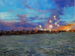 A painting of a city skyline at dusk with a vibrant display of fireworks in the sky. The sky is a mix of blue and purple hues with white clouds, and the city lights are reflecting on the water. The painting has a textured, brushstroke style, giving it an impressionistic feel. | Celebration on Petersburg Beach, Oil Painting | 5c680749f2a3725537adb2b3a0b0f11d19d2bb8c9a6f6a4a3008fa0646cc40f8 | 000000031496 | 0 | 0 | 51 | 6 | 0 | 0 | |