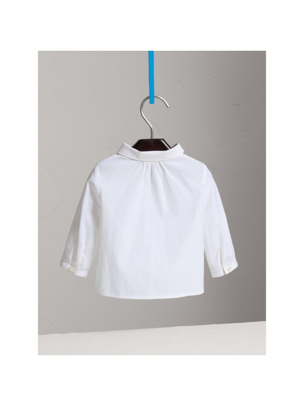 A white shirt with a collar and buttoned cuffs is hanging on a hanger against a plain background. The shirt has a small yellow tag on the left side of the collar. | Peter Pan Collar Cotton Shirt in White - Children | Burberry Hong Kong - cell image 3 | 36515dd42532b2fd07e19946df94741964298a3e9e713d0a087fc1b3f56d7551 | 000000031459 | 0 | 0 | 32 | 17 | 0 | 0 | |