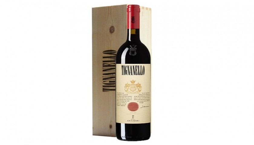 A bottle of Tignanello wine is displayed on a wooden stand. The bottle has a red label with the word 'Tignanello' and a gold emblem featuring a crown and a shield. The label also includes text and a vintage year. The bottle is dark red with a red cap and a cork. | 2015 Tignanello Magnum Wine Bottle (1,5 L) | 65361375d394ba3faf24da99c367c15ee09db2f34db07c92d900f9e54d448128 | 000000031536 | 0 | 0 | 52 | 7 | 0 | 0 |