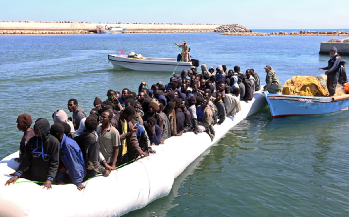A group of people are crowded onto a large inflatable raft, with some standing and others sitting. The raft is floating on a body of water, and there are two boats in the background. One boat is white and appears to be a fishing boat, while the other is blue and has a cargo hold. There are also several people standing ... | Illegal migrants from Africa arrive on shore after being rescued by Libyan coast guards. | 7a9890b87b8daa749bea242a85d779f03637912f898e974aeb3484ec66f934ac | 000000031583 | 0 | 0 | 67 | 14 | 0 | 0 | |