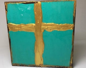 A wooden cross with a gold finish is mounted on a teal background. The cross has a textured appearance with visible brush strokes and a slightly raised surface. The gold finish is applied in a way that gives it a three-dimensional effect, with some areas appearing more reflective than others. | Cross Decor, Cross Art, Cross Painting | d11c930a38c4966c7d64678537ffe1a674f6faf0df9aaea5418d533e52c36b48 | 000000031579 | 0 | 0 | 50 | 6 | 0 | 0 | |