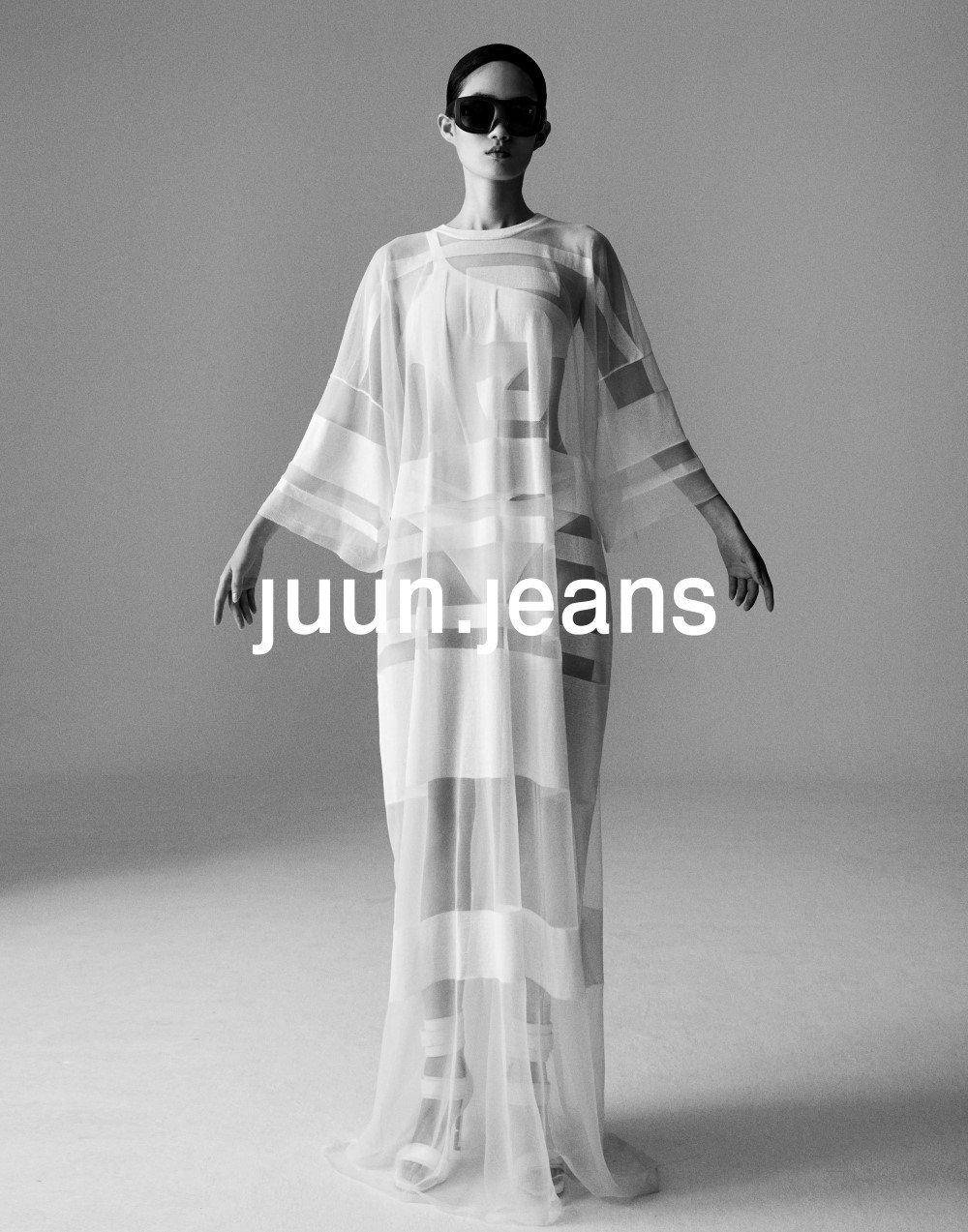 A person is standing in a white studio wearing a flowing white dress with a pattern of horizontal stripes. The dress has a V-neckline and is long, reaching down to the ankles. The person is wearing sunglasses and has a neutral expression. The background is a plain white wall. | Juun.J Spring/Summer 2023 - Paris Fashion Week Men\xe2\x80\x99s | 8cd06718fcab299039f6f24997a1f884352da0bed2a4eaa45f751b1baea51b08 | 000000031441 | 0 | 0 | 49 | 8 | 0 | 0 | |