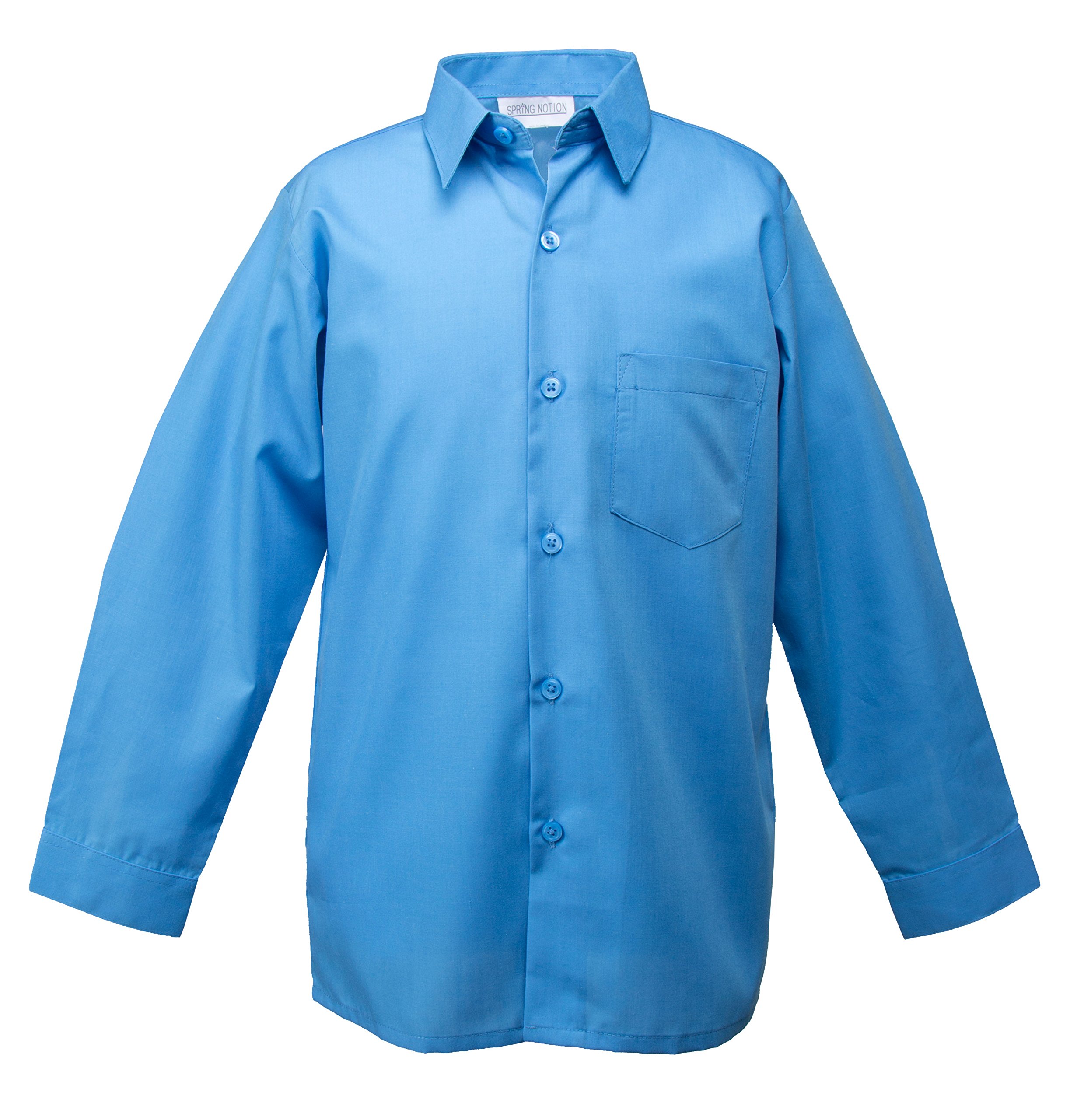 A blue shirt with a collar and buttoned cuffs is displayed against a white background. The shirt has a buttoned placket and a pocket with a button on the right side. The sleeves are rolled up to the elbows, and the shirt appears to be made of a smooth fabric. | Spring Notion Big Boys' Long Sleeve Dress Shirt 12 Sky Blue | 4bc9c754757366b63558bd592cd1638e9b066205e554ddc170b455b64ef1a672 | 000000032115 | 0 | 0 | 50 | 11 | 0 | 0 | |