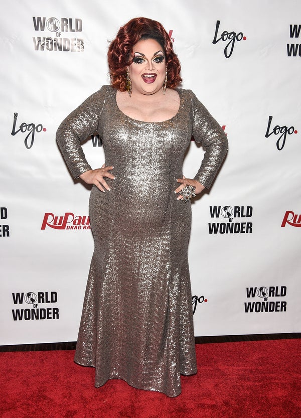 A heavyset woman in a silver sequined dress is posing for a photo at an event. She is standing on a red carpet with a backdrop featuring a 'World Wonder' logo. The woman has a confident smile and is wearing a ring on her left hand. | NEW YORK, NY - JUNE 01: Ginger Minj attends 'RuPaul's Drag Race' Season 7 Finale And Coronation on June 1, 2015 in New York | ced10e327551a29efda4eb03081f42759db4aae7d8f2b74e2d37ac4bc77d6fbb | 000000032196 | 0 | 0 | 46 | 24 | 0 | 0 | |