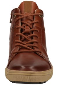 A close-up of a brown leather sneaker with visible stitching and laces. The sneaker has a smooth, glossy finish and a sole with a patterned design. | Jana - High-top trainers - cognac nappa 327 - 4 | 48b6e773e3d83e72dc0edb5bec9080889aec9bcddb95d142d43e142cdc703c96 | 000000032220 | 0 | 0 | 26 | 10 | 0 | 0 | |