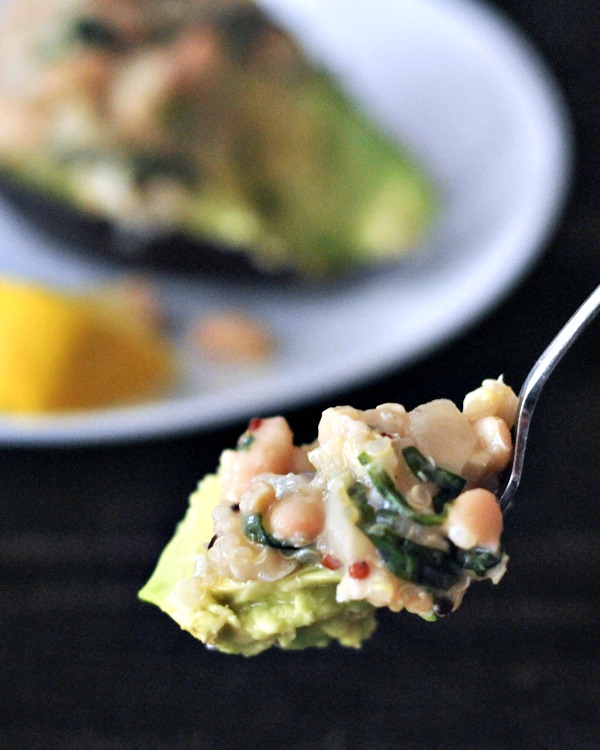 A close-up image of a fork holding a piece of food that appears to be a salad with beans, avocado, and spinach. The salad is on a white plate, and there is a slice of lemon on the plate to the left of the salad. The background is dark, and the focus is on the fork and the salad. | Lemon Basil Quinoa Stuffed Avocados @spabettie | 4a7f57862ec52aec0f193b730a5ce5eb10f9e477aaa899e43163a6a6dfd52abb | 000000032140 | 0 | 0 | 59 | 6 | 0 | 0 | |