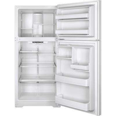 A white refrigerator with two doors, one on the top and one on the bottom. The top door has a freezer section with two shelves and a water dispenser on the left side. The bottom door has a refrigerator section with three shelves. The refrigerator is empty, with no items inside. | 18.2 cu. ft. Top Freezer Refrigerator in White | b3745b8307dace208abdf5d4c50ee740db2a9586461456a12d0644a49431c353 | 000000032286 | 0 | 0 | 51 | 8 | 0 | 0 | |