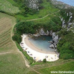 Aerial view of a sandy beach with a small lake in the center, surrounded by lush greenery and a dirt path leading to the beach. There are several people scattered around the beach, some sitting and others standing. The beach is bordered by a grassy hillside with patches of trees. | playa gulpiyuri espana | 4a119c2f7d338f0019c8cf81acc11af3d368b4274cd85e738b74c2a9a806e61a | 000000032324 | 0 | 0 | 50 | 3 | 0 | 0 | |