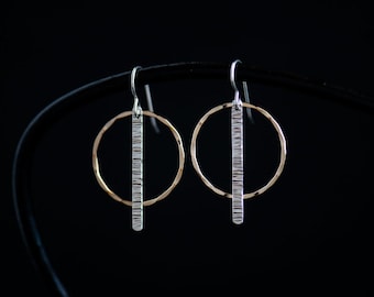 A pair of gold hoop earrings with a textured surface and a thin, vertical line running through the center of each hoop. The earrings are hanging from a black leather strap against a dark background. | NEW Mixed Metal Silver & Gold Dangle Earrings|Minimalist Handmade Jewelry|Mothers Graduation Anniversary Hammered Gift|CareKit FREE SHIPPING | 68f9e47bbcab7482d979c57c4a21b624102d5670c641dbde8fdb860b951d0de6 | 000000032576 | 0 | 0 | 35 | 16 | 0 | 0 | |