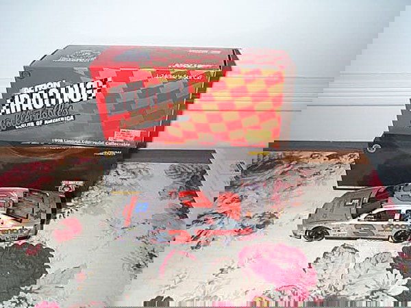A small die-cast car is placed on a floral-patterned tablecloth, with a box of 'Action Racing Collectibles' behind it. The car is predominantly silver with red and white accents, and the box features a red and gold checkered pattern with the words 'Action Racing Collectibles' in white. | RCCA Elite Collectible Dale Earnhardt #3 Silver Sel | 16753763bc65d4a0c5fca5944a14408c627b52dcff7e12aafecfb8a8b52793b1 | 000000032670 | 0 | 0 | 47 | 8 | 0 | 0 | |