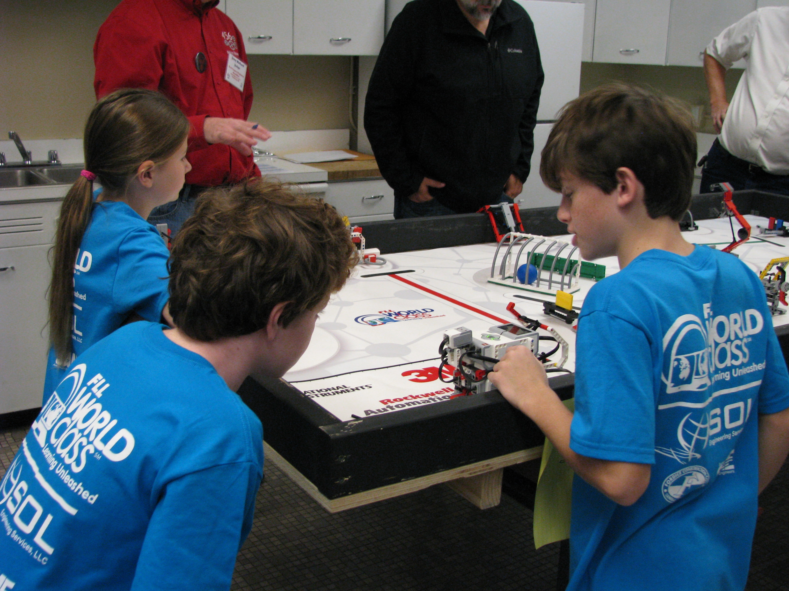 A group of children and adults are gathered around a table with a robot game setup. The children are wearing blue shirts with the word 'WORLD' on them, and the adults are wearing red and black shirts. One of the children is holding a piece of paper, and another is looking at a robot. The adults are observing the childr... | FLL World Class Learning Unleashed | a59d2023a9d2b343da4b73da5a93017cb231969911c2c33ced12d79f6434b602 | 000000032740 | 0 | 0 | 69 | 5 | 0 | 0 | |
