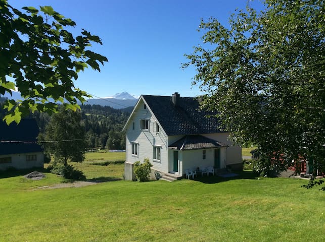 A quaint white house with a blue roof is nestled in a lush green field. The house has a chimney and a small porch with a few chairs. A large tree with green leaves is partially obscuring the view of the house. In the background, there is a mountain with a clear blue sky above. | Idyllic traditional farmhouse in fjord district | d03b1350aa9e77103b6f2557a6444c8be6a6ba47e0539f8509ea24b8c729b641 | 000000032852 | 0 | 0 | 55 | 6 | 0 | 0 | |
