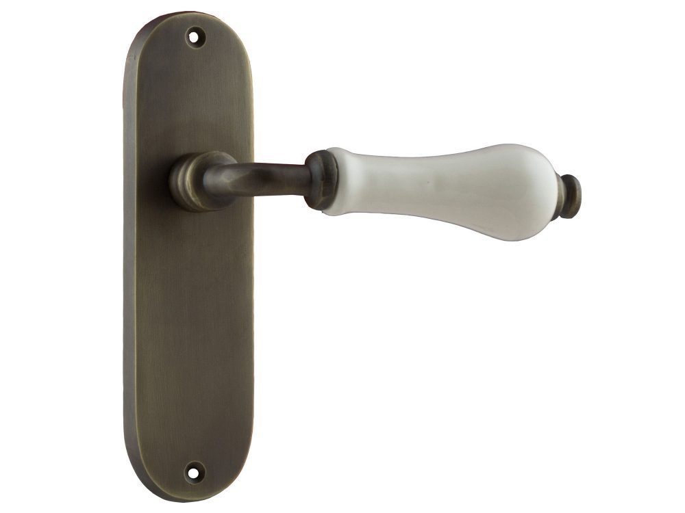 A modern white door handle with a smooth, rounded shape and a metallic finish is mounted on a dark brown door. | Exeter Lever with Porcelain on Plain Plate | 19515c8e9467007c2793fa992a76efa7f67db14c6b425c710751a6e3acd6520b | 000000032765 | 0 | 0 | 21 | 7 | 0 | 0 | |