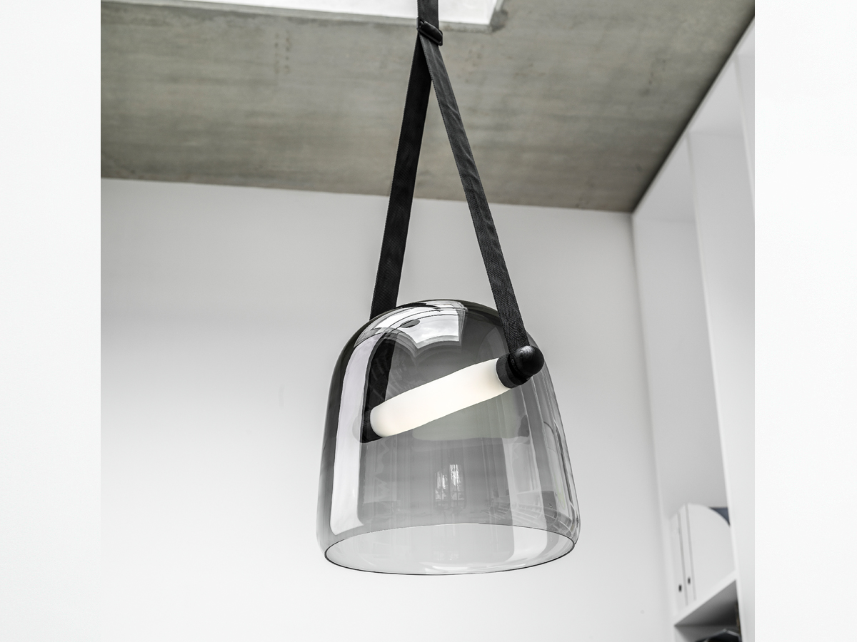 A modern glass pendant light with a black strap hangs from the ceiling in a minimalist white room. | lighting pendant foscarini shot london aplomb large at products screen | 5d465d92b0dfb0988cf66d570e0dffbe998c1da788d69f23488a3f00b96b7e97 | 000000033127 | 0 | 0 | 18 | 10 | 0 | 0 | |