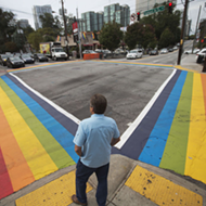 A man in a blue shirt and blue jeans stands at a pedestrian crossing with a rainbow-colored crosswalk. The scene is set in an urban environment with cars and buildings in the background. There are traffic lights above and a street sign to the right. | Petition asks city of Orlando to install rainbow crosswalks near Pulse | 8fb61f090fc3c5ceefbcf7f1e7c9748a9b443f7ff50fc1c364e296e5e5cba48a | 000000033156 | 0 | 0 | 45 | 11 | 0 | 0 | |