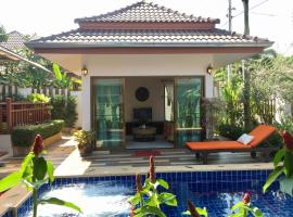 A modern Thai-style house with a tiled roof and glass doors, featuring a swimming pool in the foreground with a lounge chair and a red cushion. The house has a flat roof and is surrounded by lush greenery and palm trees. | Mojo Premium Pool Villas - Hua Hin 102 | ce7d3e9dd6f5b2dfc6b3dc2d3ef64cda028ef8031bf67377cf525d79958233cc | 000000033252 | 0 | 0 | 41 | 8 | 0 | 0 | |