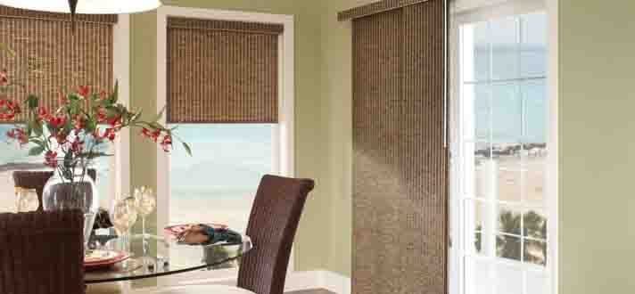 A dining room with a glass table set for four, featuring a vase with red flowers, a bowl of fruit, and a plate with a sandwich. The room has green walls, a beige carpet, and a large window with brown curtains. The view outside shows a beach with a clear sky. | horizontal blinds for sliding patio doors The Finishing Touch | 92796384f10ff197b3d9166a9e819ef3edd8f4abef06714ad9230083e99a0d90 | 000000033205 | 0 | 0 | 51 | 9 | 0 | 0 | |