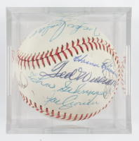 A baseball encased in a clear glass display case with signatures from various individuals, including a prominent signature in the center. The baseball has a red stitching pattern and is predominantly white with a few blue and red markings. The signatures are in blue ink and appear to be from a variety of people, with s... | MLB Hall of Famers OL Baseball Signed by (15) with Burleigh Grimes, Earl Averill, Bob Feller, Stan Musial, Joe Cronin, Ted Williams with Display Case (SportsCards LOA) at PristineAuction.com | a9f9588208b52522cb2eb7d3840358b76cb2079a0e7097b1f2c41c2c9ec1e374 | 000000033418 | 0 | 0 | 71 | 29 | 0 | 0 | |