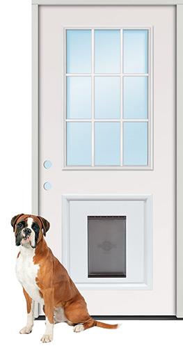 A brown and white dog is sitting on the floor in front of a white door with a clear glass window. The door has a black handle and a black keyhole. The dog is looking towards the camera with a curious expression. | 9-Lite Steel Prehung Door Unit with Pet Door Insert | db736dbbe758c8932bd5fff5e0e9ade2c2f3b79e53a9e1163bba77fd4e23a372 | 000000033923 | 0 | 0 | 42 | 9 | 0 | 0 | |