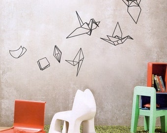 A room with a red chair and a white chair, both with a green cushion on the seat. On the wall, there are several origami paper cranes in various sizes and positions, with some appearing to be in flight. The floor is covered with a green carpet, and there is a red bookshelf filled with books to the right. | Paper Evolving into Origami Bird - Pop Wall Sticker Wall decal Art | 4da9d05e76b46fd83b36a2e2a0bda4dd161c3be745e78b87f92a6ff739aa9b92 | 000000034226 | 0 | 0 | 59 | 12 | 0 | 0 | |