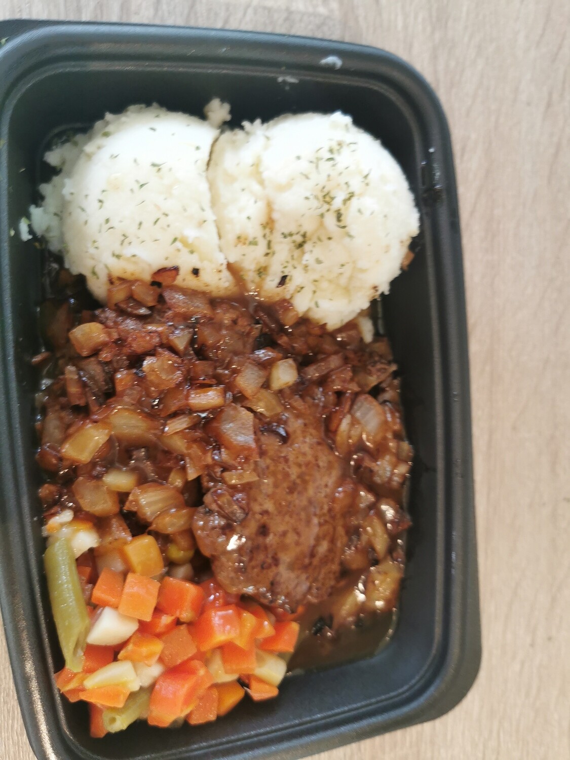A close-up view of a plate of food with a focus on the meat and potatoes. The meat appears to be a type of sausage or meatloaf, and the potatoes are mashed with a sprinkle of herbs. The plate is on a wooden surface, and the lighting is soft and natural, highlighting the textures and colors of the food. | Hamburger steak | e9d05cf1d245c6674f901b4af815a5399039523e47ad4ec57aa3164844cc46c1 | 000000034415 | 0 | 0 | 59 | 2 | 0 | 0 | |