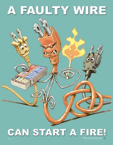 A cartoonish illustration of a faulty wire with a menacing face, surrounded by various electrical components such as a fuse, a plug, and a wire coil. The wire is depicted with a twisted and tangled appearance, and the text 'A FAULTY WIRE CAN START A FIRE!' is superimposed over the image. | Faulty Wires Safety Posters in ENGLISH pic 1 | 94d14ff9c6c8cac76d53b689c4ec44746a03ef037d99f1a281f717ebdb42b88f | 000000034866 | 0 | 0 | 51 | 8 | 0 | 0 | |