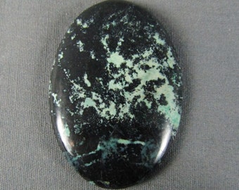 A black and green jade stone with a smooth surface and a glossy finish is displayed against a grey background. | Sonora Sunrise Cabochon Chrysocolla, Cuprite Designer Cabochon | ef190048c51da3ef8486590b89573c3f064e5ebd15e07bf757dfc512ff04ad66 | 000000035019 | 0 | 0 | 20 | 7 | 0 | 0 | |