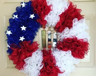A patriotic wreath with a red, white, and blue color scheme is hanging on a door. The wreath is adorned with white and red ribbons, and blue stars. The door is white with a black door handle and a mirror above it. | USA Wreath, Patriotic Wreath, 4th of July Wreath, Americana Wreath, Stars and Stripes Wreath, America Wreath, Porch Wreath, American Flag | 55fce8badf0497eae36184578654792ec62020650b316249aa355344fa121b43 | 000000035169 | 0 | 0 | 42 | 20 | 0 | 0 | |