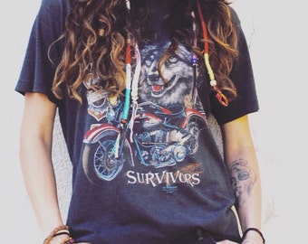 A person with long hair wearing a black t-shirt with a graphic design of a motorcycle and the word 'SURVIVORS' on it. The person has multiple colorful beaded necklaces and a bracelet on their left wrist. | Vintage 1991 Survivors Harley Davidson shirt- Size Large | e0c33fc30cc5e033b08c21372a49aeadadb2f28a9c6bee80859fe44b1f069ffa | 000000035410 | 0 | 0 | 36 | 8 | 0 | 0 | |