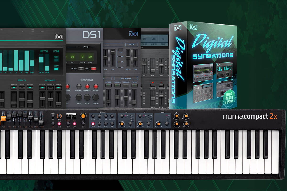 A digital audio workstation (DAW) with a keyboard interface is displayed. The DAW has a black and blue color scheme with various buttons, sliders, and screens. The keyboard interface is black with white keys and is labeled 'NUMACOMPACT2X'. A box with the text 'DIGITAL SYNTHEZIATIONS' is placed to the right of the DAW. ... | Produkty Studiologic z UVI Digital Synsations | df4e136fde417fa51f18db2e55e4ea2af2b84856fe120e57d39c98cef306f868 | 000000035334 | 0 | 0 | 62 | 6 | 0 | 0 | |