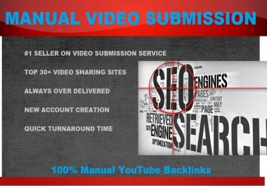 A promotional poster for a manual video submission service. The poster features a large red 'MANUAL VIDEO SUBMISSION' text at the top, with a smaller '1% SELLER ON VIDEO SUBMISSION SERVICE' text below it. The poster also includes a list of benefits, such as 'TOP 30+ VIDEO SHARING SITES', 'ALWAYS OVER DELIVERED', 'SEO E... | make a Video Submission on 50 Video Sharing Sites, Online Marketing | e903e29ffbabd91e85f9271ea55c54203b45fa22af43b3a8d11f47d1900e93db | 000000034983 | 0 | 0 | 82 | 11 | 0 | 0 | |