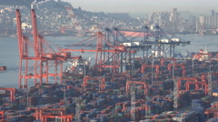 Aerial view of a bustling port with numerous cranes and cargo ships. The port is surrounded by a cityscape with tall buildings. The sky is clear, and the water is calm. | Cargo ships are loaded at the container terminal in Busan, South Korea - stock footage | 4a23d8191d3ed2efa147fc6cfd52e4ba51bd8eda7d46a93cfe9878d57cc6ac0b | 000000035493 | 0 | 0 | 31 | 15 | 0 | 0 | |