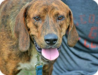 A brown dog with a blue collar is sitting next to a person wearing a grey shirt with a red logo. The dog has its tongue out and is looking directly at the camera. | Plott Hound Mix Dog for adoption in Hazlehurst, Georgia - Clance | 3eca4032f636c3012f52abe1f7521cff1892c65e0576e9850a6a53b9085ed6b3 | 000000035477 | 0 | 0 | 34 | 11 | 0 | 0 | |