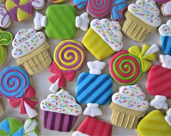 A collection of colorful candy-shaped cookies is arranged on a white surface. The cookies are designed to resemble various candies, such as lollipops, cupcakes, and ice cream cones. Each cookie has a glossy finish and is adorned with vibrant colors and details that mimic the appearance of real candies. The cookies are ... | Sweet Shop cookies/Candy cookies | a1677565105326a91ddae49499cd97499d37269a621cc0b9d4834159c9cc2669 | 000000035496 | 0 | 0 | 64 | 4 | 0 | 0 | |