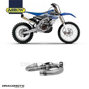 A close-up image of a blue and white dirt bike with a prominent front wheel and a detailed exhaust system. The bike is positioned against a white background with a yellow and black 'ARROW' logo in the top left corner. The image is overlaid with a white border and the text 'DRACOMOTO' in the bottom left corner. | Ponteira Arrow Race Tech - Yamaha 450 | 7a771118d40185726b365a3d94d082f0bc2b8f41c1ea5342d9d109454ca19ebc | 000000035610 | 0 | 0 | 57 | 7 | 0 | 0 | |