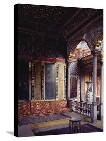 A sepia-toned image of an ornate room with a high ceiling, featuring intricate designs and patterns. The room has a large window with a view of a garden, a red and gold patterned rug on the floor, and a decorative vase on a pedestal. The walls are adorned with framed paintings and the room is illuminated by natural lig... | Hunkar Lounge in Sultan's Private Apartments in Harem, Topkapi Palace, Historic Areas of Istanbul--Stretched Canvas Print | e4960a8f1100f01c1ebc440f124db714324dd9fc9c50481e9c651d6e5dfb77cf | 000000035676 | 0 | 0 | 59 | 16 | 0 | 0 |