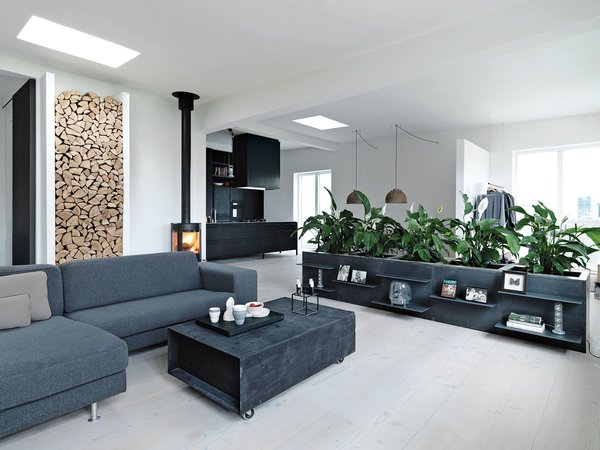 A modern living room with a gray sofa, a black coffee table, and a black bookshelf filled with books and decorative items. There are large windows with white frames, a white ceiling, and a white floor. A fireplace with a woodpile is visible, and there are potted plants around the room. | The Scandinavian pavilion will be decked out with furniture and accessories that embody Hygge\xe2\x80\x94a Danish term implying warmth, coziness, and friendliness. This renovated loft in Copenhagen by Vipp Chief Designer online Morten Bo Jensen and his wife, Kristina May Olsen highlights that concept.\n\nPhoto by Anders Hviid. | d6a56efcc0450b06fdf1d886d5bb3b85842225f4aa139b1f979568bdb36a9409 | 000720943433 | 0 | 0 | 51 | 46 | 0 | 0 | |