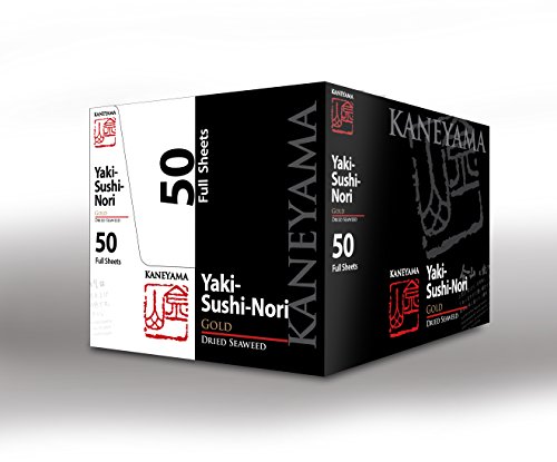 A black and white box with the word 'KANEYAMA' in red and white on the top, and 'YAKI-SUSHI NORI' in red and white on the bottom. The box has a red and white logo on the top left corner and a red and white logo on the bottom right corner. The box is closed and the contents are not visible. | Kaneyama Yaki Sushi Nori / Dried Seaweed (Vacuum-packed/re-sealable), Premium Gold Grade (Full Size 50 Sheets 10 Packs) by Kaneyama (Image #2) | a800147d9bfcc109a6170fb1adf63152184e23155961f6d8098754bd2b1f7c2c | 000720943525 | 0 | 0 | 60 | 21 | 0 | 0 | |